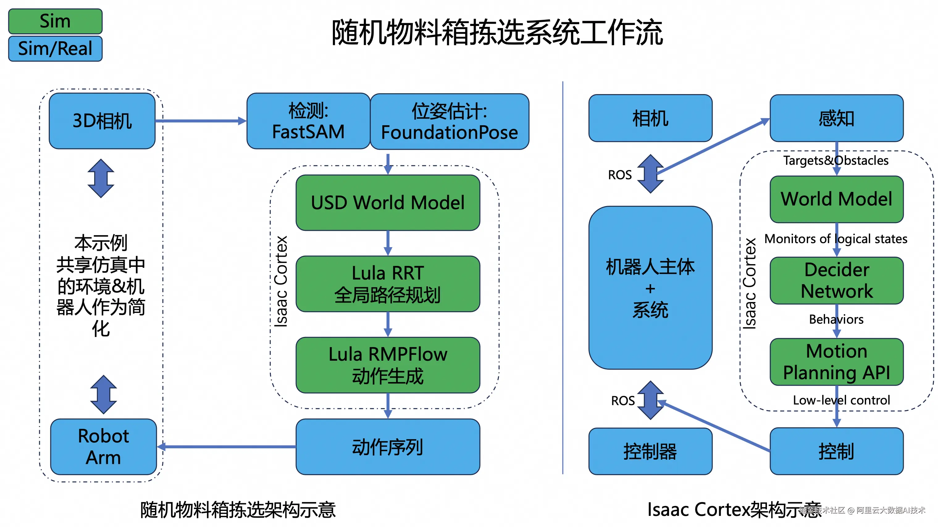 PAI - Notebook Gallery >> 基于Isaac Cortex搭建随机物料箱拣选系统 PAI 支持整合使用 Isaac Cortex 和 Isaac Sim的机器人工具,形成一个统一的协作机器人系统,来实现复杂的交互机器人调度工作,并利用开源算法库 Foundationpose 和 FastSAM 实现快速目标检测及 Pose 估计完成环境感知,基于Isaac Sim的Lula库实现机器人运动规划和控制,从而完成随机物料箱拣选系统搭建。