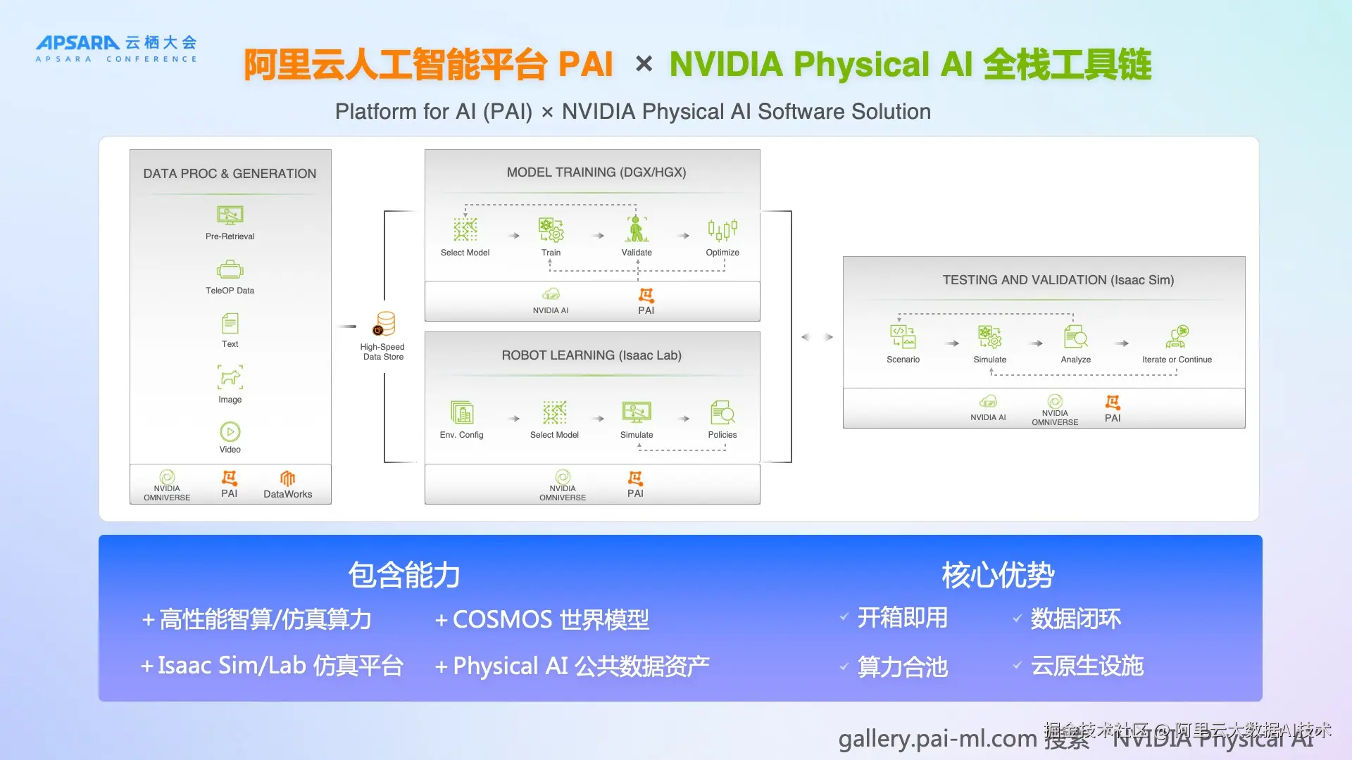 2025云栖大会上,阿里云与 NVIDIA 宣布合作,PAI 将集成 NVIDIA Isaac Sim、Isaac Lab、NVIDIA Cosmos、Physical AI 数据集在内的 NVIDIA Phsyical AI 软件栈 ,并结合阿里云在规模化数据计算、高性能AI训练推理、大数据AI一体化开发等领域的体系化能力,形成覆盖数据预处理、仿真数据生成、模型训练评估、机器人强化学习、仿真测试在内的****全链路平台支撑,让 Physical AI 领域开发者充分享受云的弹性与灵活,加速 Physical AI 创新落地。