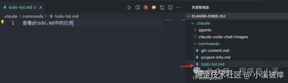 创建项目自定义文件 /Users/claude-code-cli/.claude/commands/todo-list1.md 输入相同提示词,重启Claude Code CLI,在 claude-code-cli 工作区可以查看自定义命令