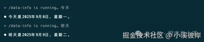 输入 /data-info 今天/明天 可以看到 $ARGUMENTS 参数占位符将我们输入的日期代词传递给了自定义命令并为我们准确输出了日期信息