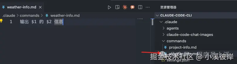 $ARGUMENTS 参数占位符也可以动态接收多个参数,我们定义一个查询天气的自定义命令,提示词内容如下: