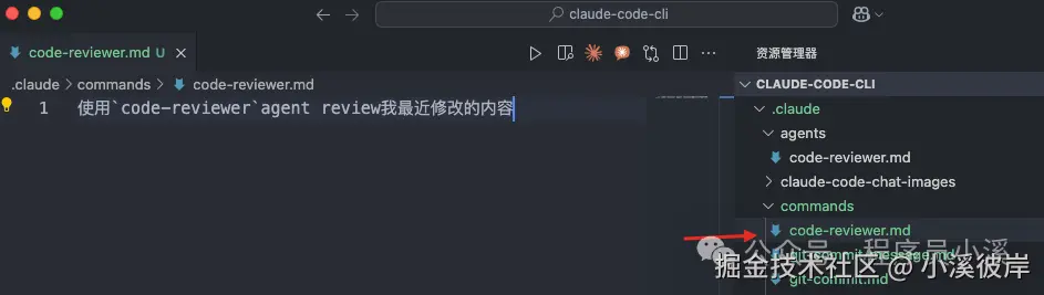 创建 commands/code-reviewer.md 文件,输入提示词内容: