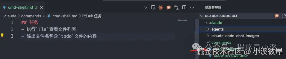 重启Claude Code CLI,使用 /cmd-shell 调用自定义命令,可以看到自定义命令输出了文件列表并输出了todo.md文件的内容