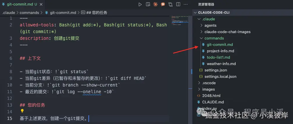 创建 commands/git-commit.md 文件,输入如下提示词: