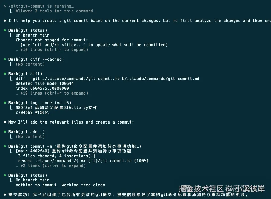 重启Claude Code CLI,使用 /git-commit 调用自定义命令