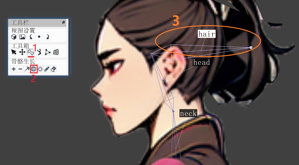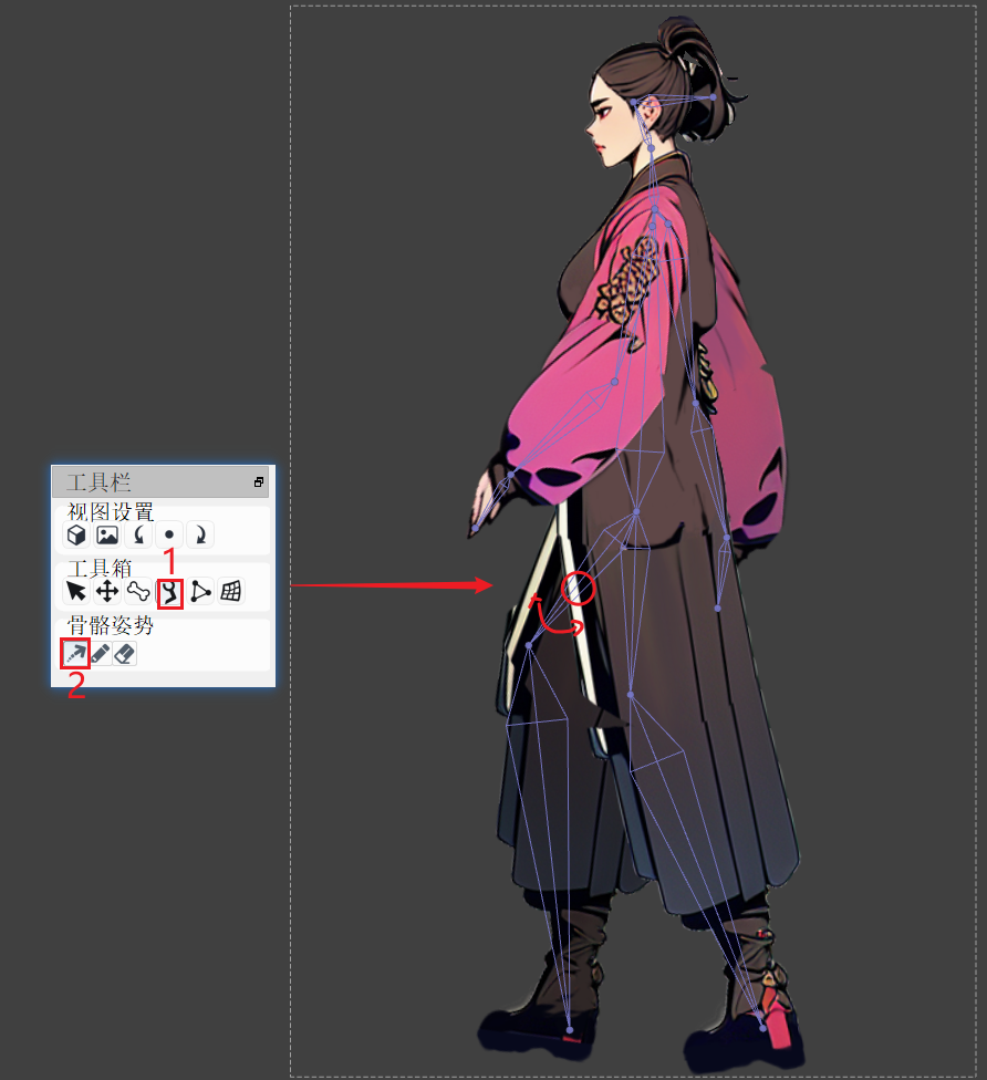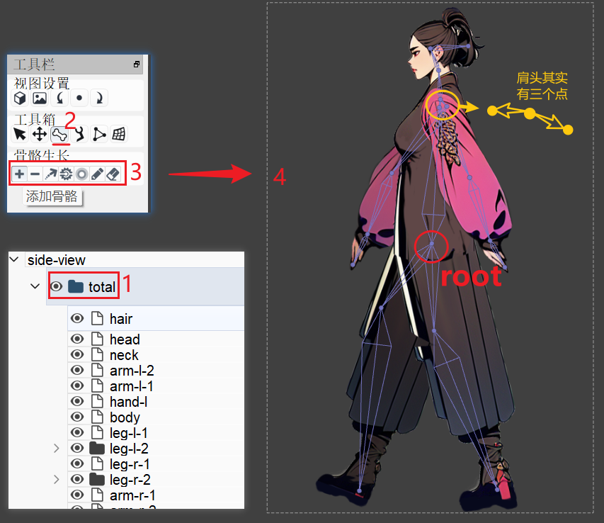 这一步是为了将骨骼和图层绑定起来- 按照图中 1、2 可以开始绑定骨骼