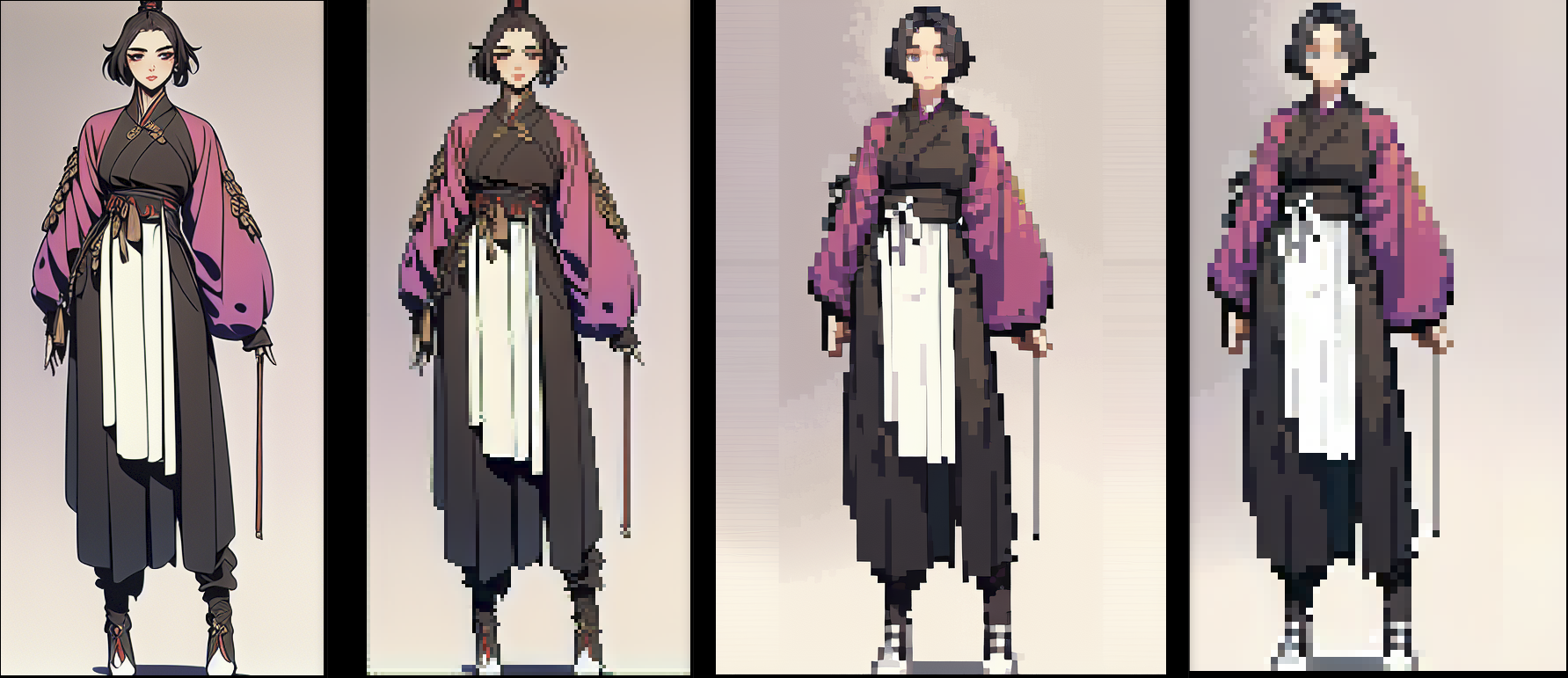 从左到右依次是:原始立绘、原始立绘像素化、转绘像素图、转绘图进一步像素化。