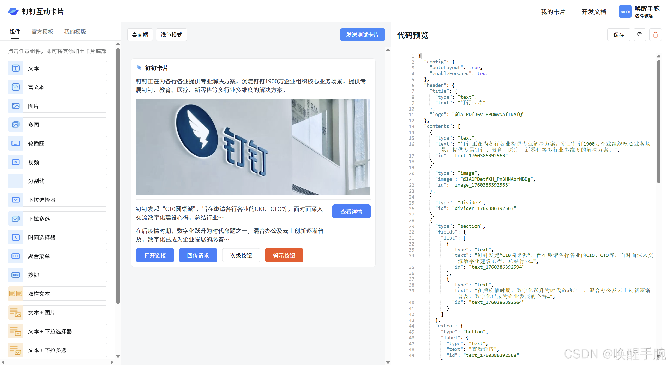 文档地址:https://card.dingtalk.com/card-builder?spm=ding_open_doc.document.0.0.721e41694qaf1r&cardType=normal