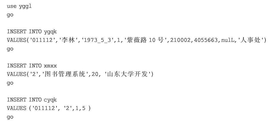 使用T-SQL命令分别向YGGL数据库的ygqk、xmxx和cyqk表中插入一行记录。