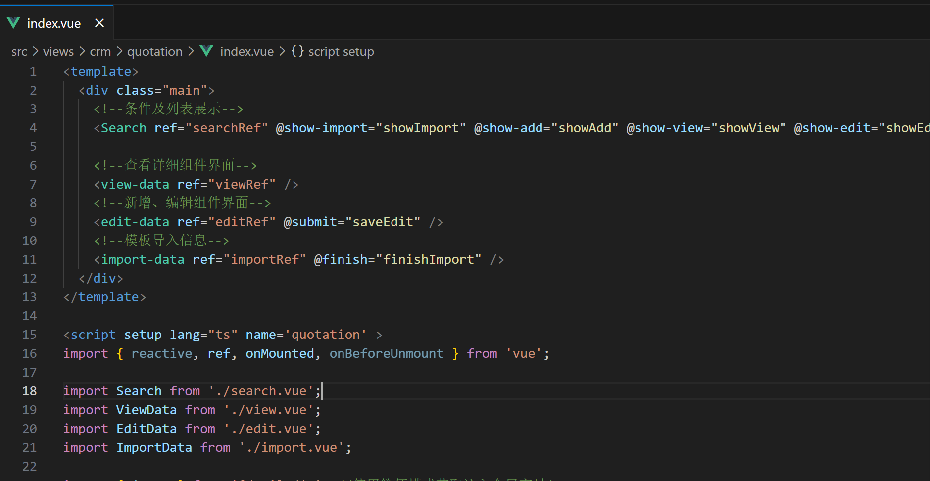 我们分别创建index.vue代表主列表页面内容, search代表查询及列表,view代表查看页面、edit代表新增或者编辑页面(两个页面类似,因此整合一起更精简),import代表导入页面,然后再index页面组合即可。