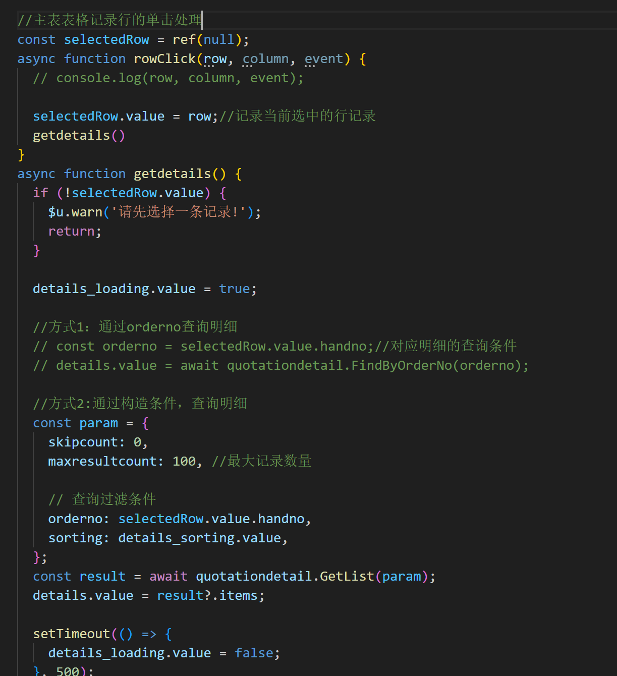 但主表记录呈现后,我们单击任何一行主表记录,会出发行单击事件的处理,从而加载从表记录的获取并显示。