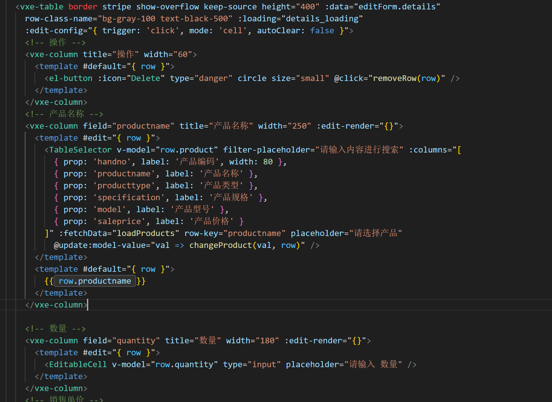 在编辑界面中,主表和常规单表一样的处理方式,从表记录通过 vxe-table 进行录入的处理。对于产品记录的列表选取,我们通过自定义组件 TableSelector 快速绑定即可即可。