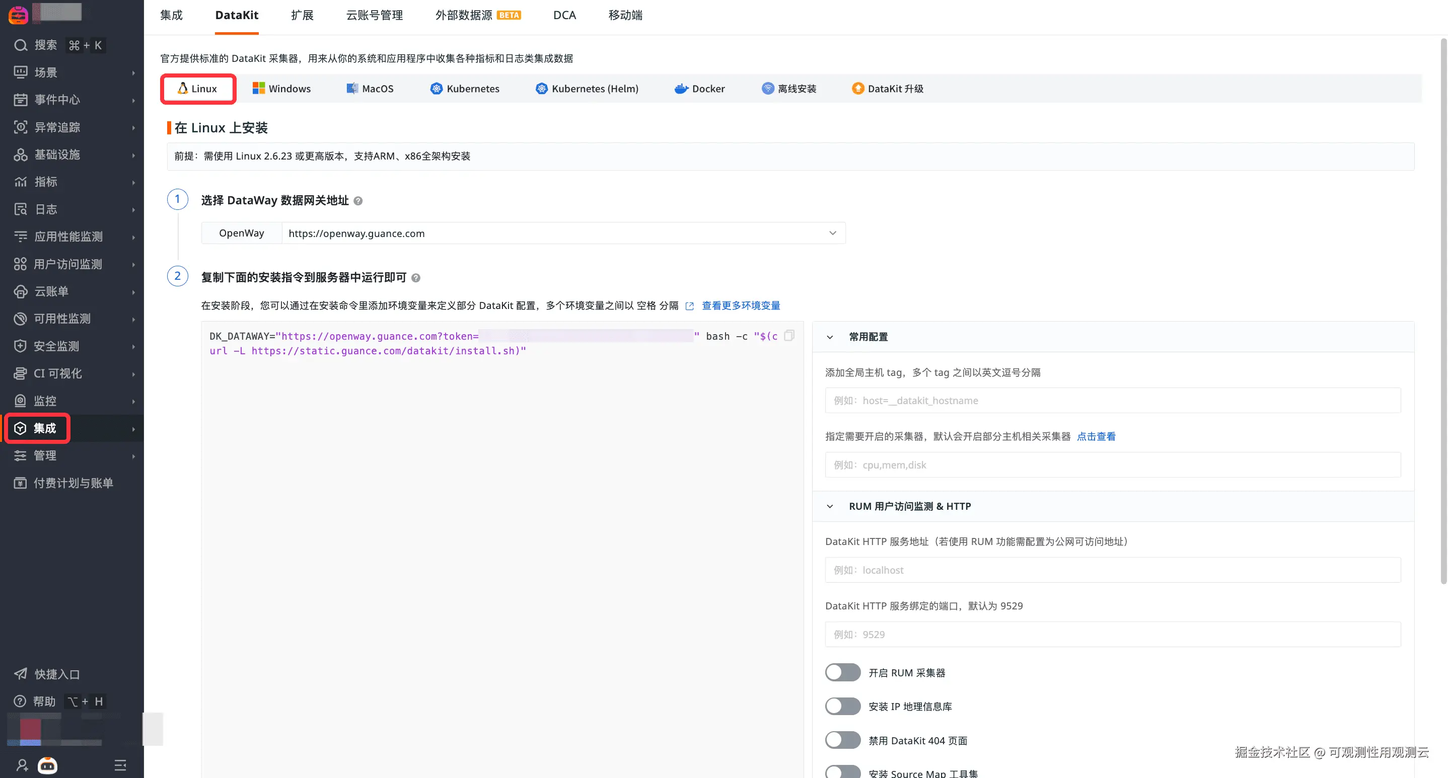 登录观测云控制台,在「集成」 - 「DataKit」选择对应安装方式,当前采用 Linux 主机部署 DataKit。