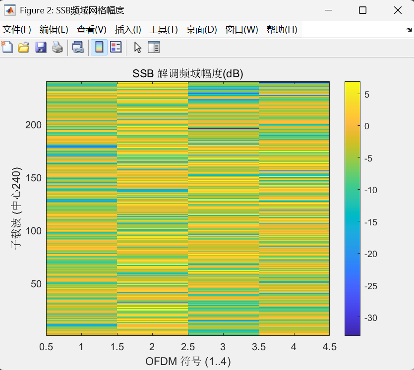 xlabel('OFDM 符号 (1..4)'); ylabel('子载波 (中心240)'); colorbar; title('SSB 解调频域幅度(dB)');