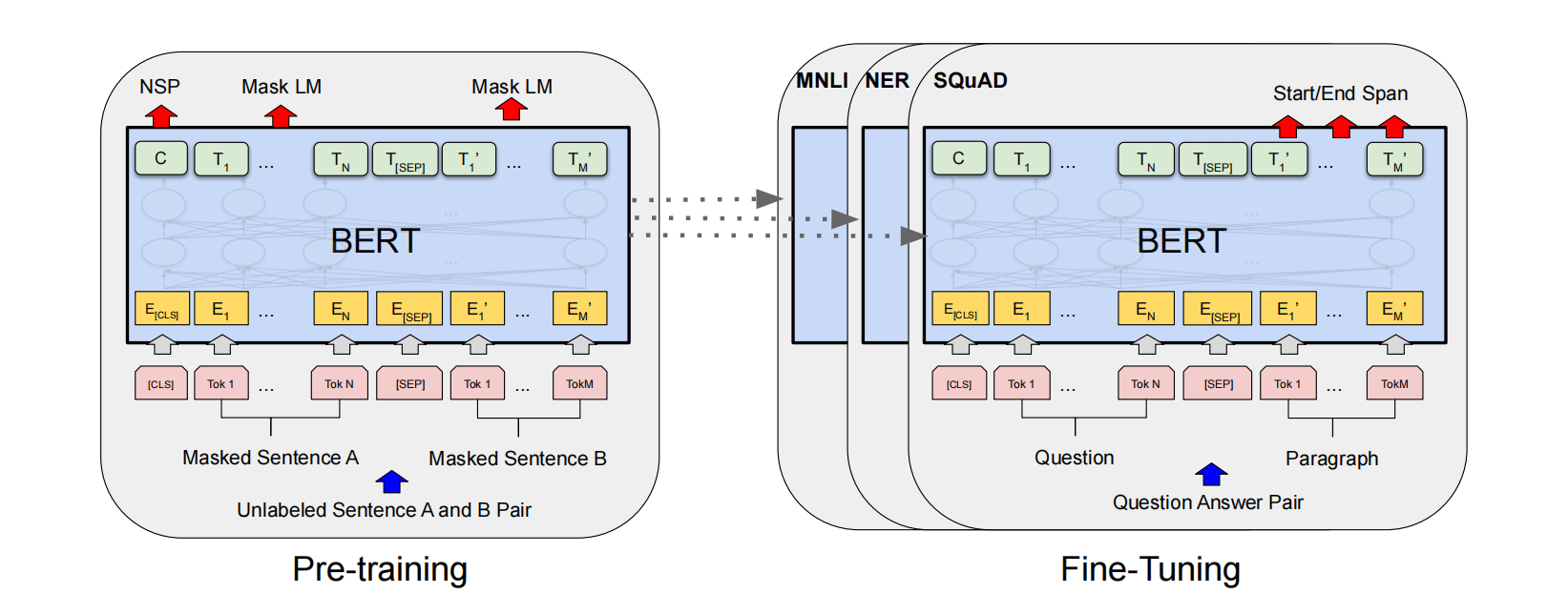 BERT采用的是 "预训练 + 微调" 的两段式学习法,就像人类先上大学,再参加岗前培训。