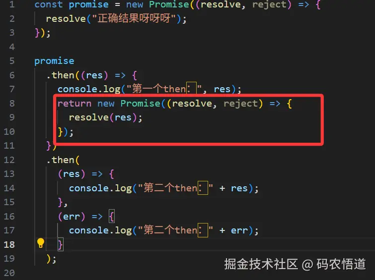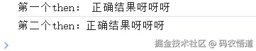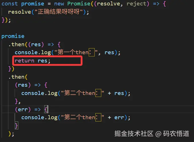 这里如果你回答错了面试官可能就不会再问了,如果你回答对了,面试官可能还会继续追问如何让第二个then 和第一个then输出同样的结果呢,第一种方式直接在第一个then 的第一个函数中return res 即可,代码修改如下: