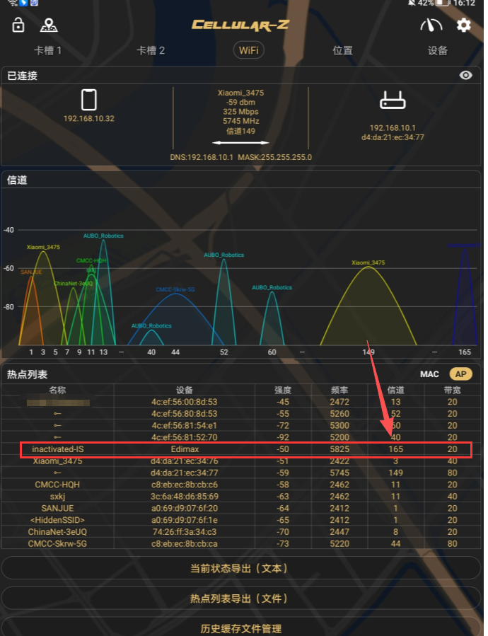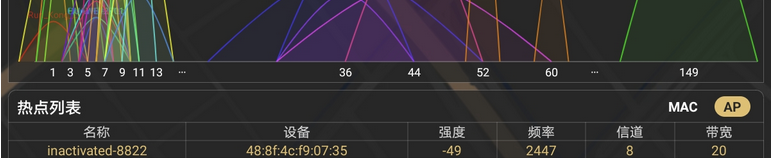 保证待测试设备天线无明显遮挡物,打开设备自发 AP 信号, 打开Cellular-Z 软件, 可查看自发AP的信号强度 、频率 、信道等信息。