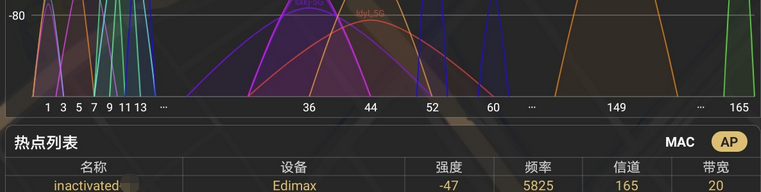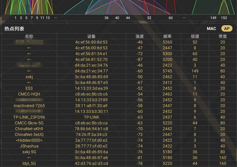 如下图所示,右上角可以切换 2.4G、5G、6G 信道, 根据它推荐的信道,去路由器或 AP 配置界面里设置推荐的信道即可(可能需要路由器或者设备重启)。