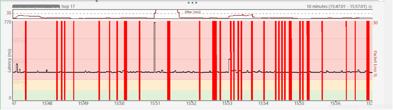 注:红色柱状体表示丢包, 黑色折线代表时延的变化。