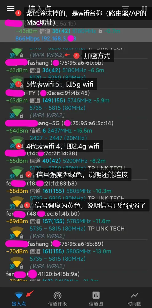 dBm 值越接近 0, 信号越强(绿色),dBm 值越远离 0,信号越弱(黄色、红色);