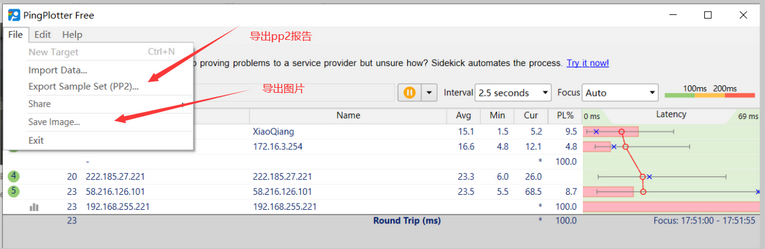 可选择导出 PingPlotter 格式的测试结果或者导出 png 图片。