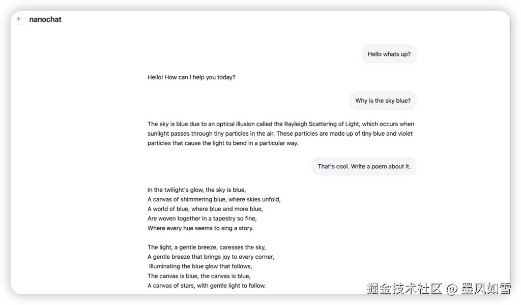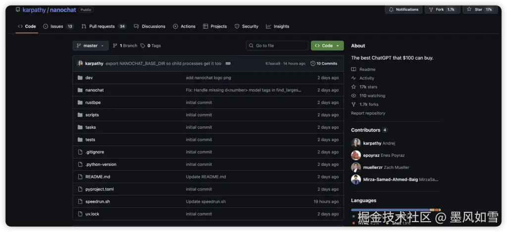 nanochat项目一经发布,GitHub上星标如潮,社区里讨论热烈,许多开发者认为它极大地推动了AI技术的民主化。它打破了传统LLM训练的神秘面纱,以一种前所未有的简洁和透明,让更多人有机会参与到大语言模型的学习和实验中来。