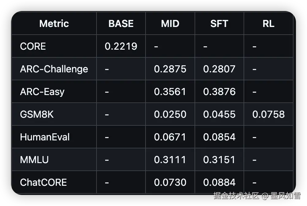- 游戏化评估: 整个训练过程并非"盲盒",nanochat会在训练中和训练后,在多个基准测试(如ARC-E、MMLU、GSM8K)上评估模型性能,并自动生成一份Markdown格式的"报告卡",以"游戏化"的方式总结成果,让训练过程充满乐趣。