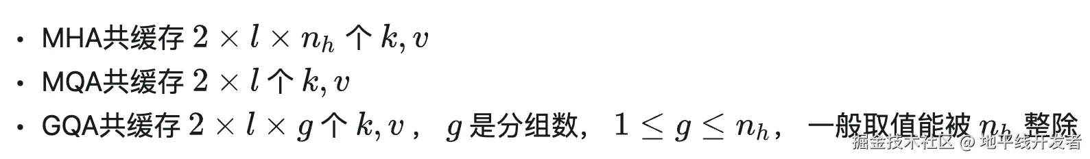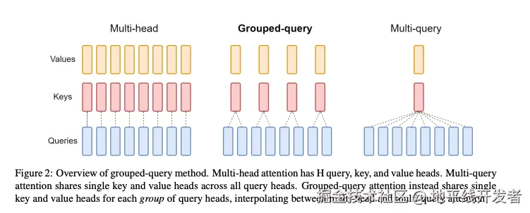 使用 MQA 的模型包括PaLM、StarCoder、Gemini等。很明显,MQA 直接将 KV Cache 减少到了原来的 1/n_h,这是非常可观的,单从节省显存角度看已经是天花板了。