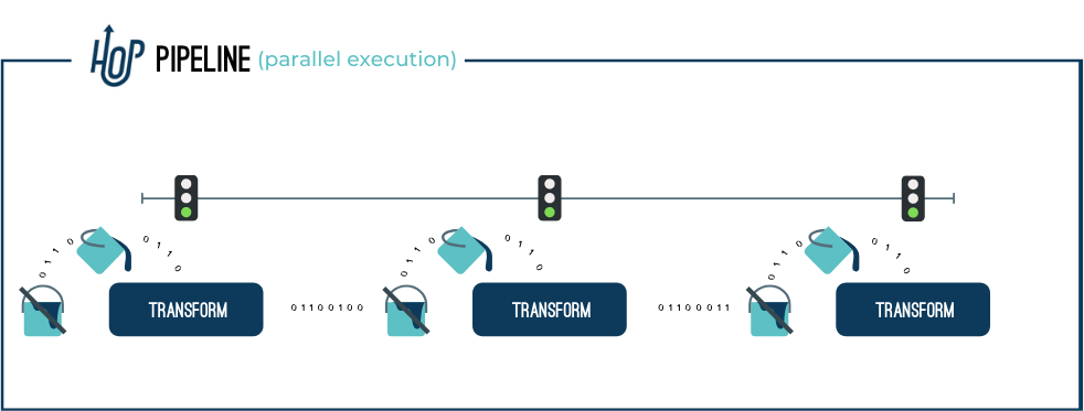 一个转换(Transform)是管道中执行的一个工作单元 。典型的转换操作包括从文件、数据库中读取数据,执行查找或连接操作,丰富、清理数据等。管道中的所有转换都是并行执行的。转换处理数据,并通过 Hops 将处理后的数据批次传递给后续操作进行处理。