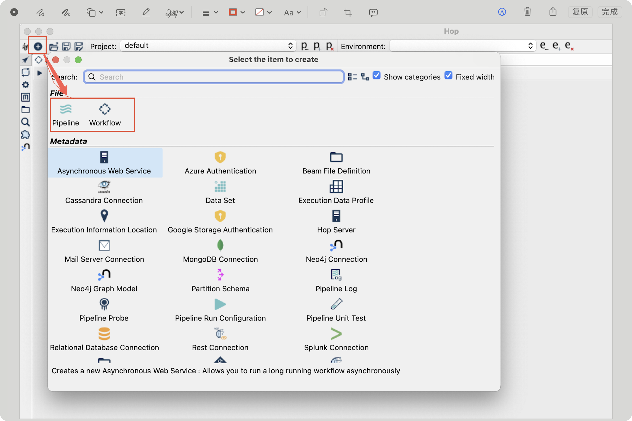 界面用于在 Hop 开发环境中创建不同类型的项目项(例如 Pipeline、Workflow)