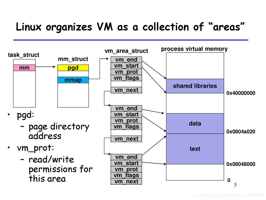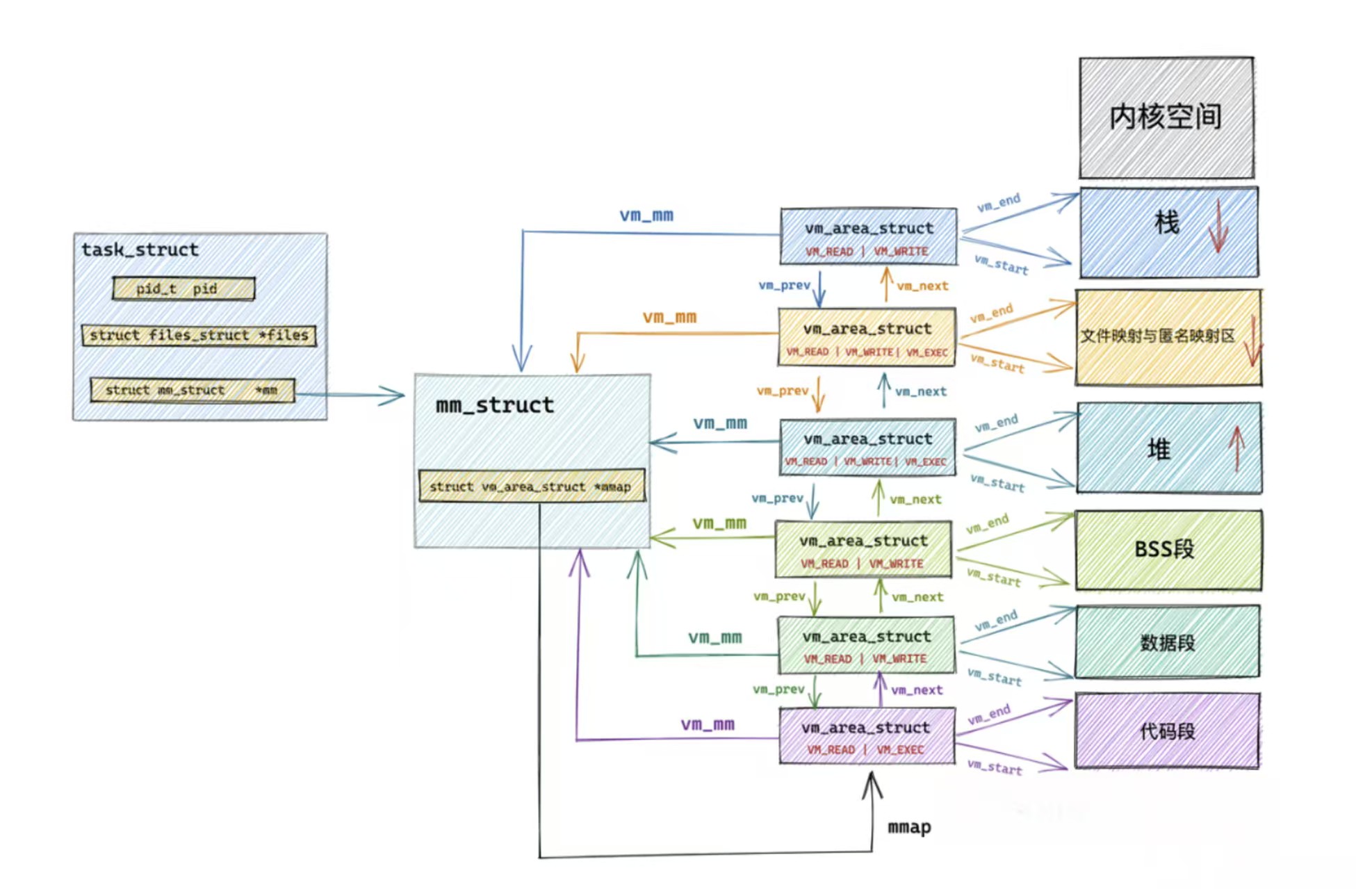 原因是我们的 mm_struct 会维护一张 vm_area_struct 的链表,这个链表会记录下来我们每一个子区域的 start 和 end。