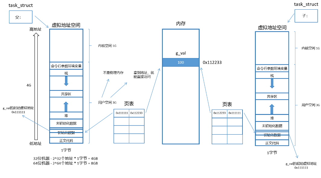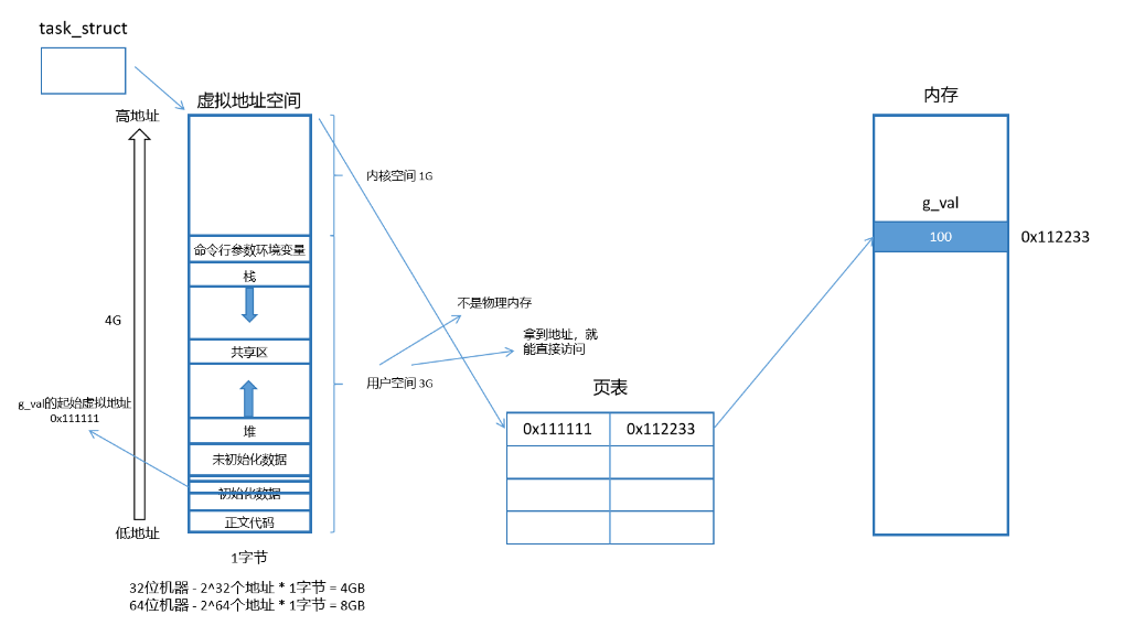 我们所能看到的地址都是虚拟地址,也就是进程的地址空间内的地址。当我们自己定义了一个全局变量 g_val = 100。那他肯定会在内存中开辟一个内存。而在我们的地址空间上也得有一个 4 字节的全局变量的虚拟地址。也就是说在内存上存在一个物理地址和地址空间上一个虚拟地址。而在我们的 OS 在创建进程时要为每一个进程构建一个叫页表的东西,和虚拟地址空间一样,我们一个进程一个页表。这个页表的左侧填充的是我们的虚拟地址,右侧填充的是我们的物理地址,当我们的进程想要访问我们的虚拟地址是,我们的操作系统可以通过我们的页表转换成内存上的物理地址,进而访问指定变量,所以我们的页表是来做我们的虚拟地址和物理地址映射的。