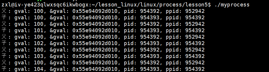 printf("父: gval: %d, &gval: %p, pid: %d, ppid: %d\n", gval, &gval, getpid(), getppid());