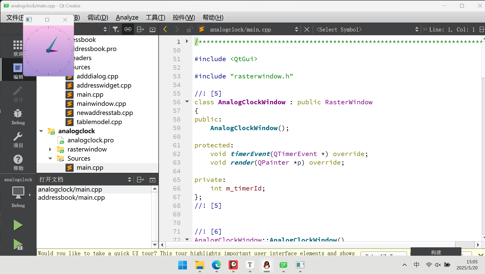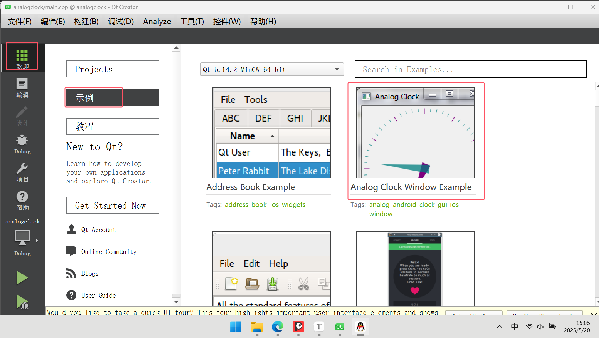 1、双击打开 Qt Creator 工具,并进入到 "欢迎模式" 下的 "示例" 界面;
