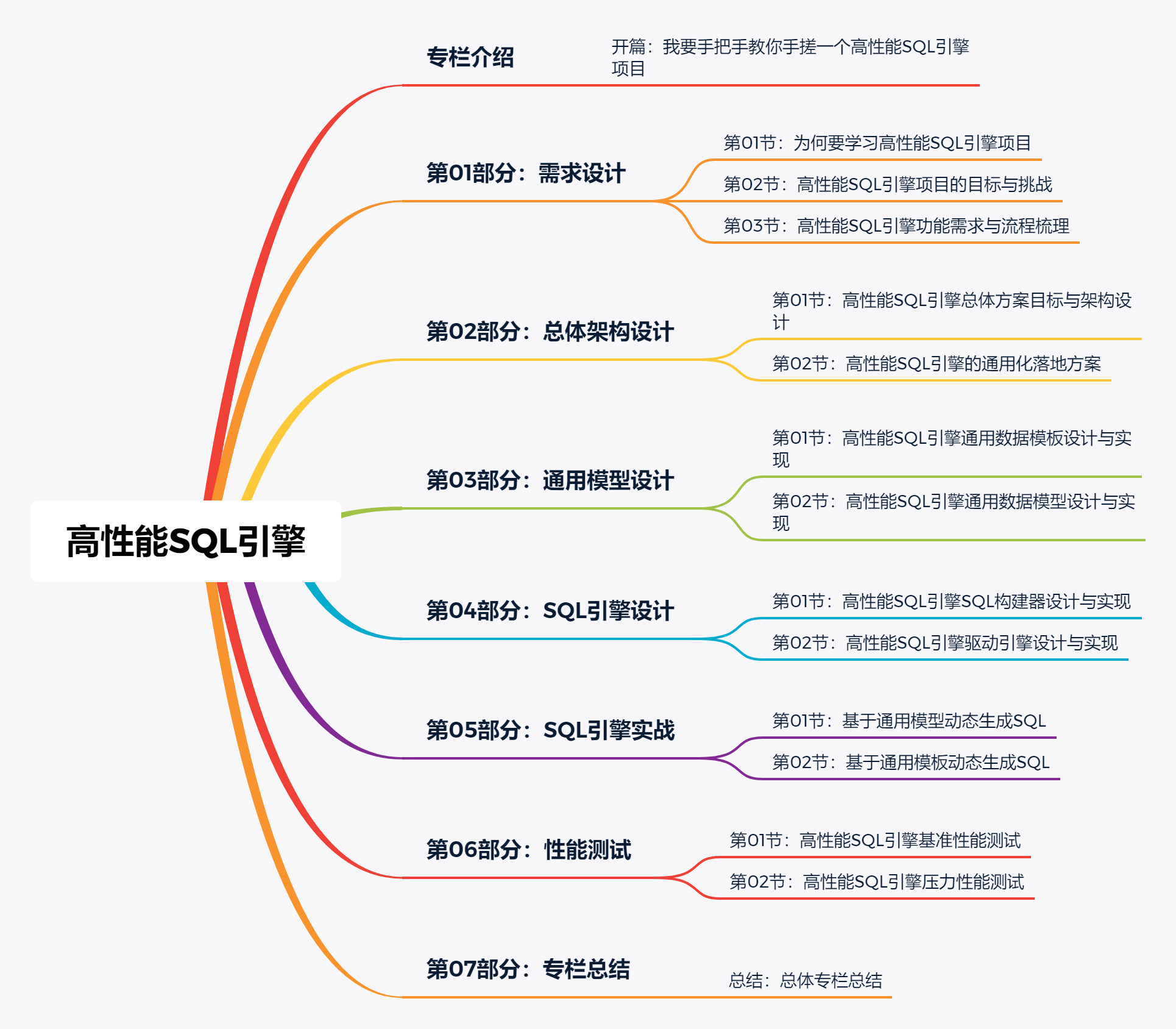 在整个《高性能SQL引擎》项目和专栏中,我们从需求设计、总体架构和通用模型设计开始,一路带着大家对高性能SQL引擎中最基础和最核心的内容进行设计和编码实现。整体专栏内容如下所示。