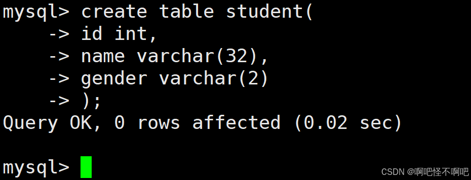 我们输入下面这行指令就可以在school这个数据库中创建student这个数据表。