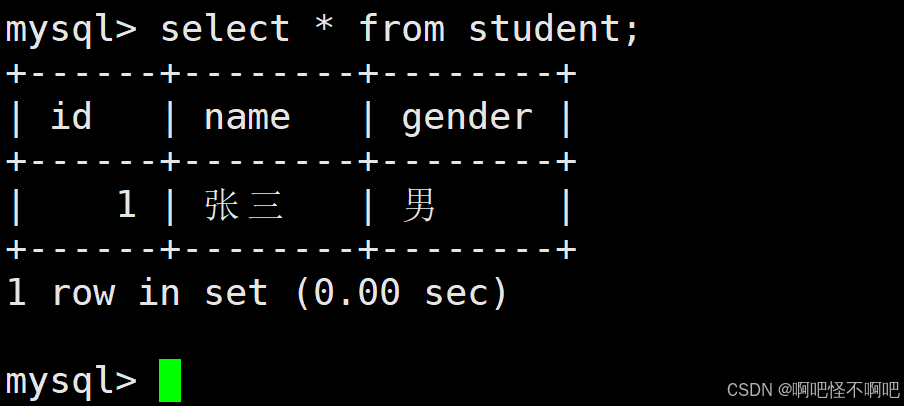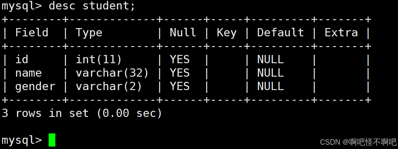 PS:和desc不一样,desc是查看这个表有那些类型,select * from student;是查看这个表里面有那些数据。
