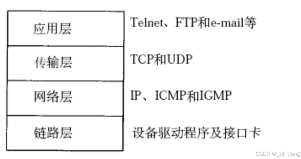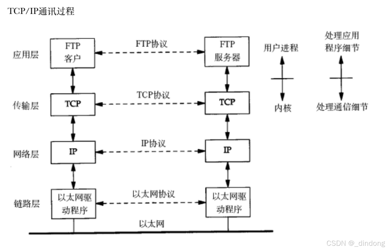 • 应⽤层: 负责应⽤程序间沟通,如简单电⼦邮件传输(SMTP)、⽂件传输协议(FTP)、⽹络远程访问协议(Telnet)等. 我们的⽹络编程主要就是针对应⽤层.