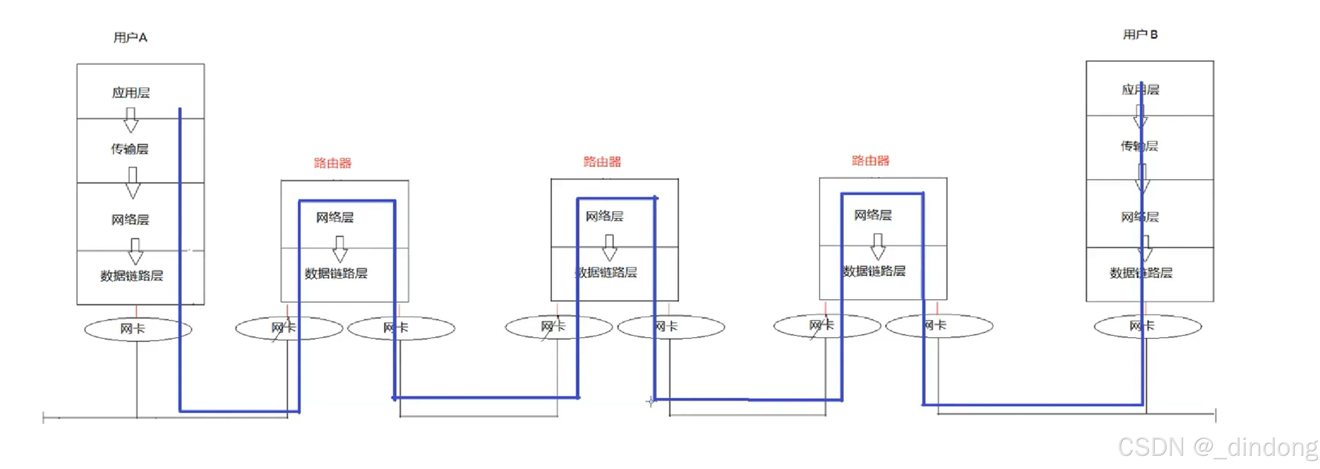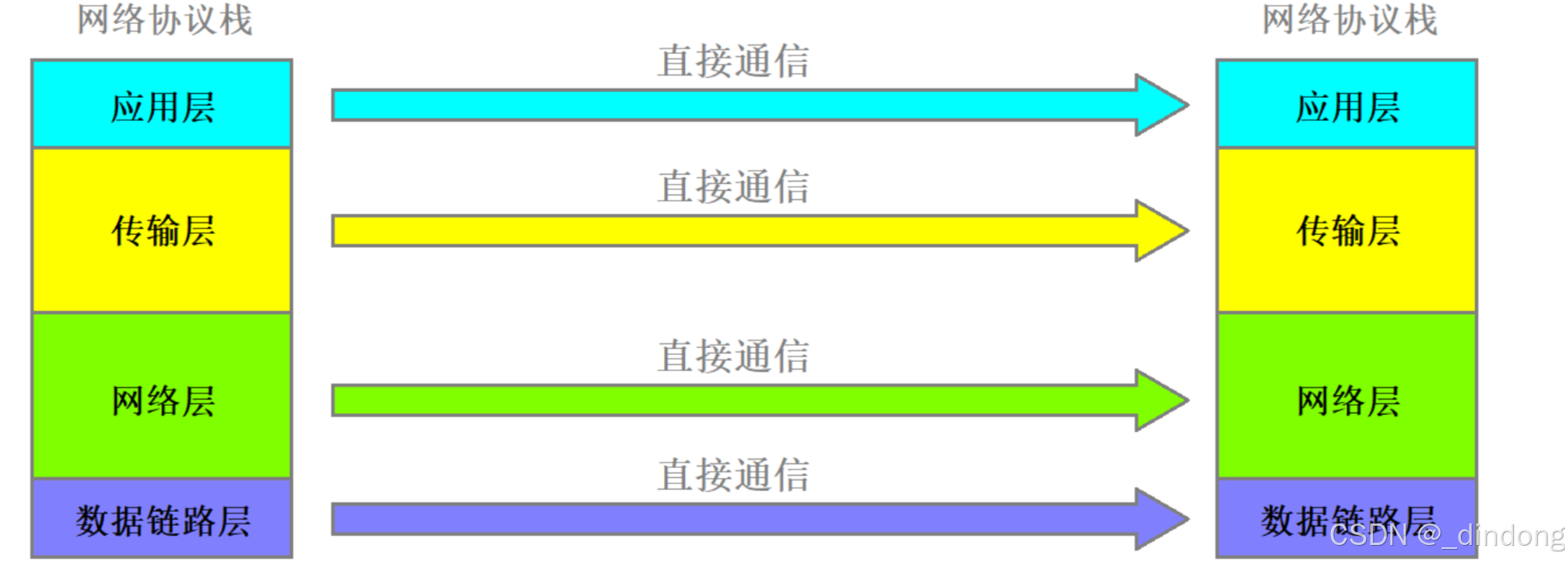 也就是说,在网络协议栈中我们可以认为通信双方的应用层之间直接在进行通信,也可以认为通信双方的传输层之间直接在进行通信,对于网络层和数据链路层也同样如此。