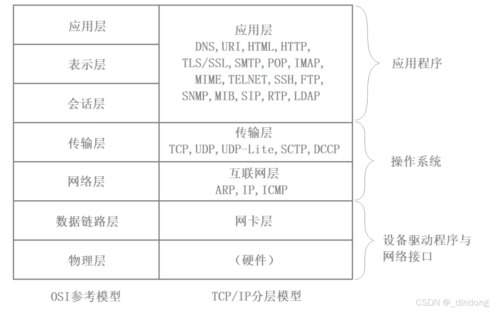 其实在⽹络⻆度,OSI定的协议7层模型其实⾮常完善,但是在实际操作的过程中,会话层、表⽰层是不可能接⼊到操作系统中的,所以在⼯程实践中,最终落地的是5层协议。