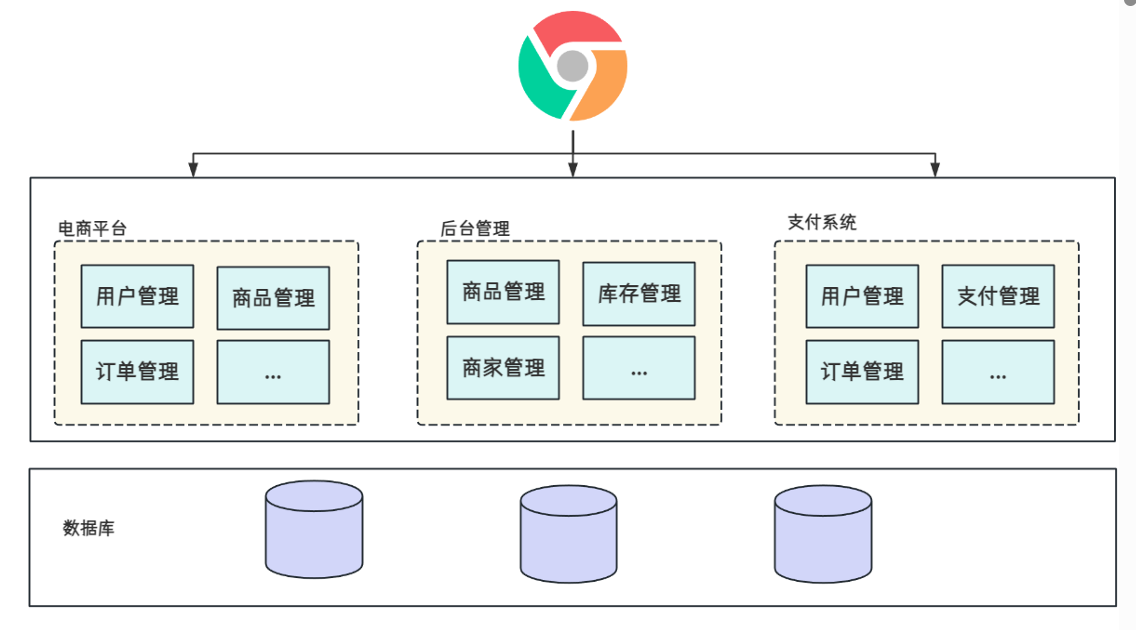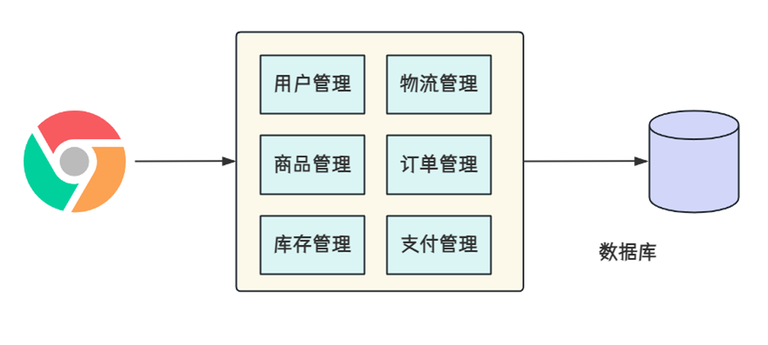 例如电商系统,将用户管理,物流管理,商品管理,订单管理.... 都写在一个 web 项目中,然后统一部署到一个 web 服务器中。这种开发模式,部署简单,一个项目就包含了所有的功能,省去了多个项目之间的交互和调用消耗