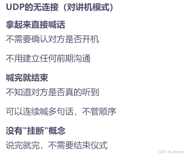 无连接就是无握手过程,就好比发送消息不需要确保对方在不在,对方有没有收到消息。