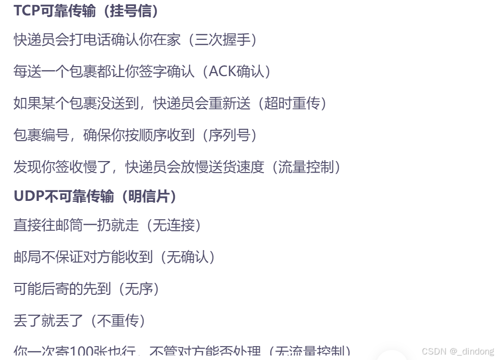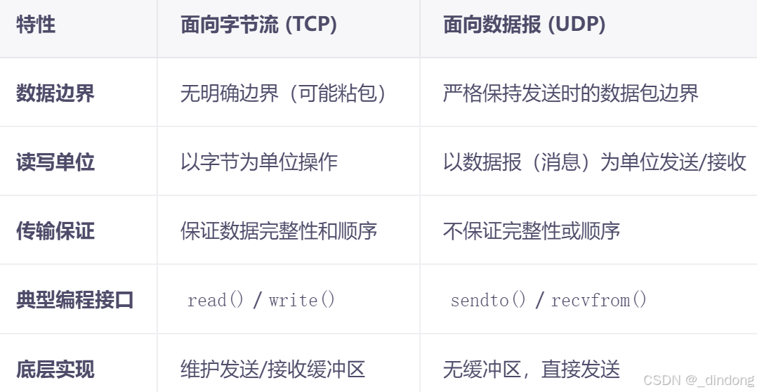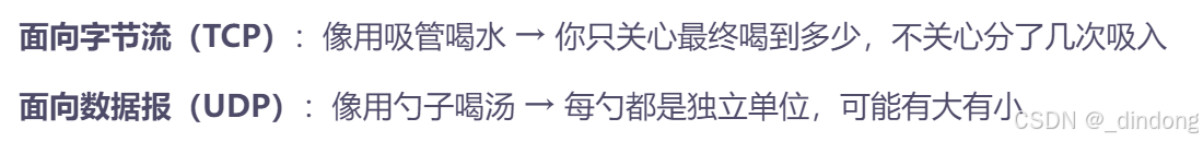 面向字节流(TCP)像持续流动的水管,发送和接收的数据是连续的字节序列,没有固定边界;面向数据报(UDP)像独立快递包裹,每个发送/接收的数据包都是明确分隔的完整单元。
