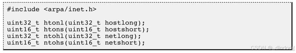 • 例如 htonl 表⽰将 32 位的⻓整数从主机字节序转换为⽹络字节序,例如将IP地址转换后准备发送。