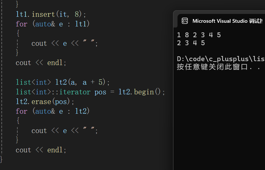 - erase会返回一个迭代器,这个返回的迭代器是删除节点的下一个节点的迭代器,如果后续还要进行操作,可以接收这个返回值