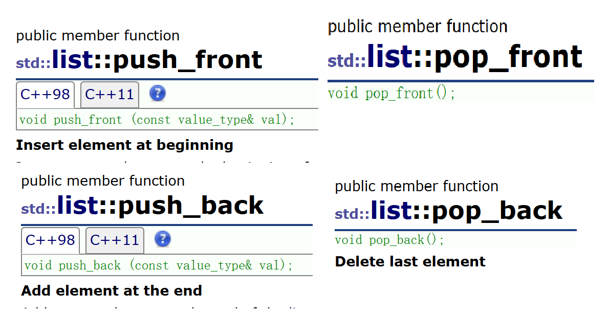 push_front/pop_front/push_back/pop_back分别是头插、头删、尾插、尾删