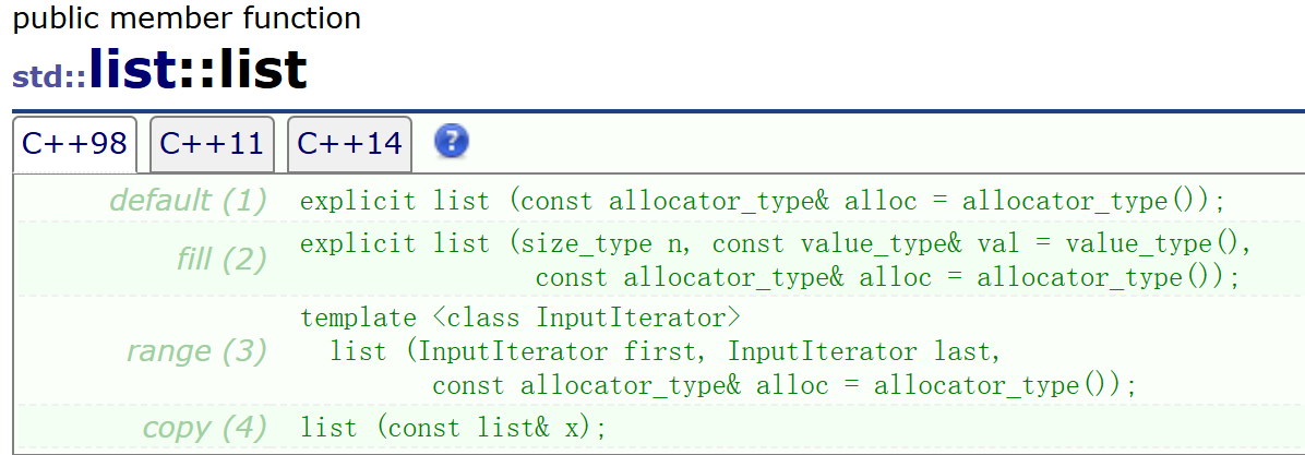 - 构造函数有全缺省的构造,缺省值allocator_type()是空间配置器,避免频繁向堆上申请空间,提高效率,默认不传参即可