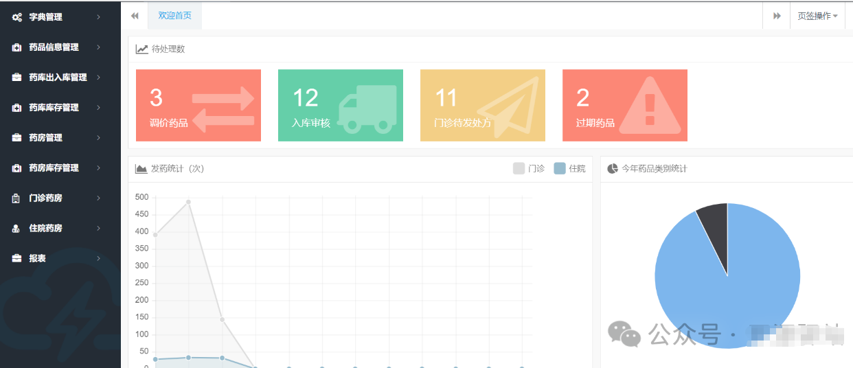提供"收入、工作量、药房发药、库房数据"等统计,支撑运营决策。