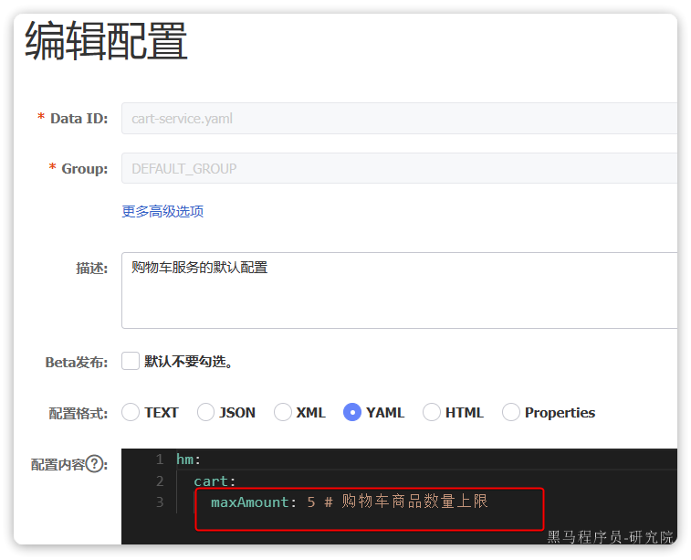 微服务共享的配置可以统一交给Nacos保存和管理,在Nacos控制台修改配置后,Nacos会将配置变更推送给相关的微服务,并且无需重启即可生效,实现配置热更新。