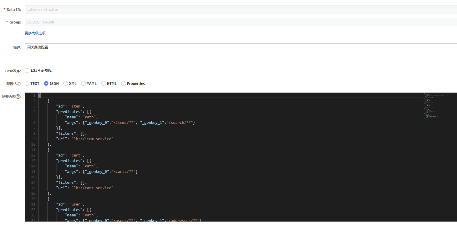 接下来,我们直接在Nacos控制台添加路由,路由文件名为gateway-routes.json